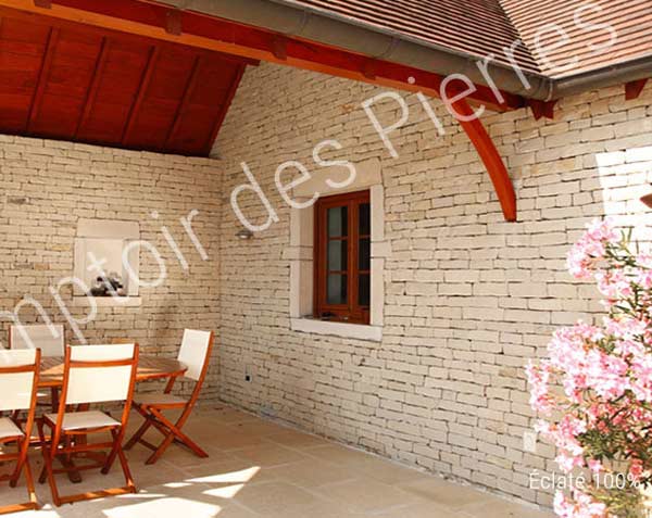Our cladding is 2.5 cm thick (± 0.5 cm) and gives the appearance of a real stone wall. Indeed, these are Burgundy stone blocks that we split. The front face of the block allows us to obtain cladding in a golden-yellow color, while the subsequent cladding made from the interior of the block is beige-cream in color (split cladding).
